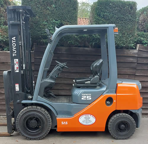 TOYOTA 02-8FDF25 DIESEL POWERED Year 2016 9015 Hours 2500 kgs lift capacity 5500mm Lift height Triplex full free lift Mast Side shift Solid Tyres Reverse beeper,Beacon etc Refurbished Will come with 12 month LOLER Certificate